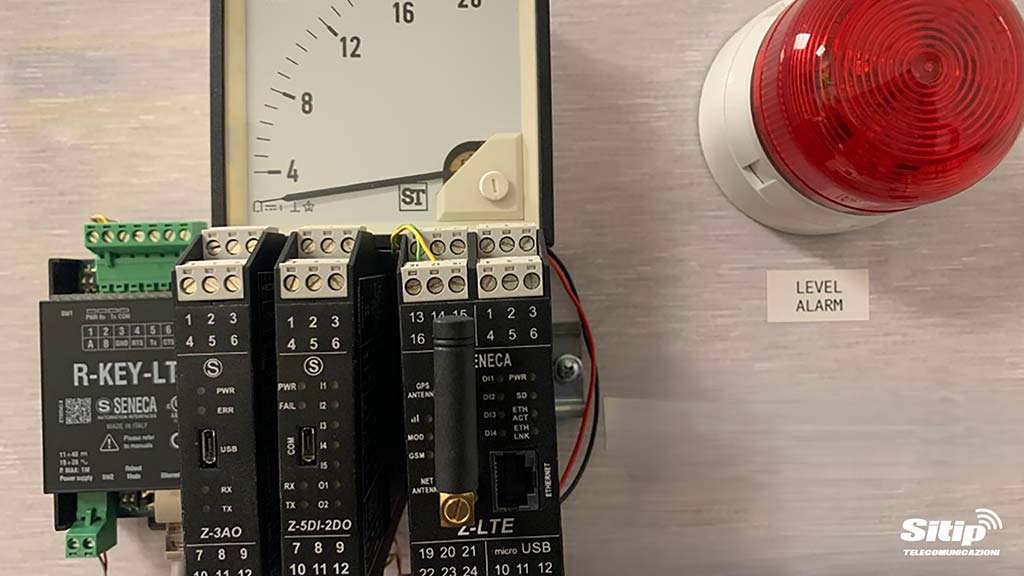 Sensori e gateway IoT Aranet (livelli e stati), connettività LTE 4G con VPN, PLC Seneca per acquisizione Modbus/TCP e conversioni 4–20 mA, alimentazione fotovoltaica ad isola.